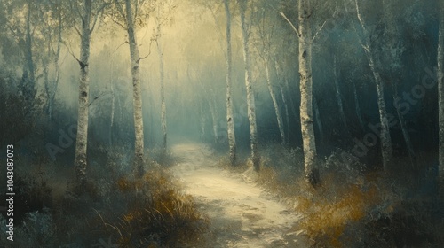 Fototapeta premium A misty forest path surrounded by trees, evoking tranquility and nature's...