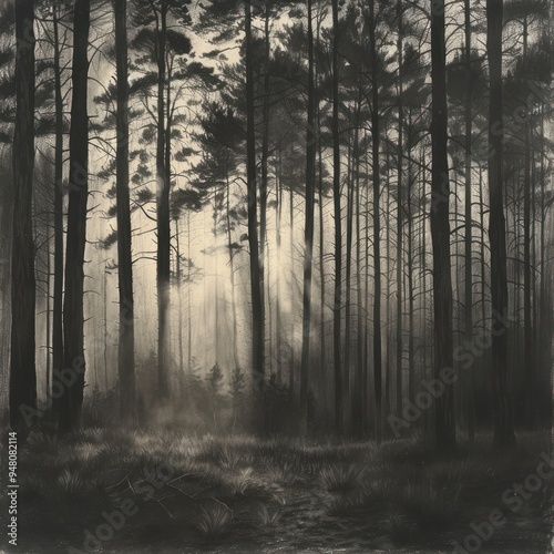 © RizArt, Fototapeta premium A Misty Forest Path Through Tall, Silhouetted Trees