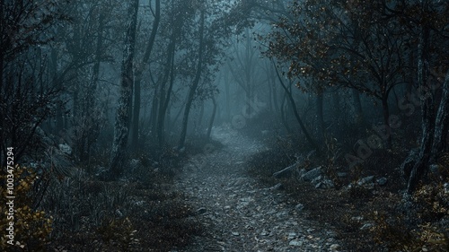 © chesleatsz, Obraz premium A Misty Forest Path Through Tall Trees