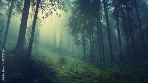 © Ali, Obraz premium A misty forest path through tall trees.