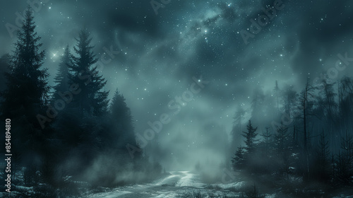 Naklejka premium A misty forest path under a starry night sky. The scene is ethereal with fog enveloping the trees and the path, creating a mysterious and serene atmosphere.