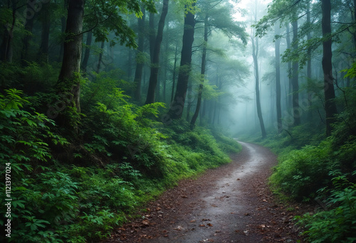 © Lupu, Fototapeta premium A misty forest path winding through a dense, lush green forest with tall trees and thick foliage, creating an atmospheric and mysterious scene