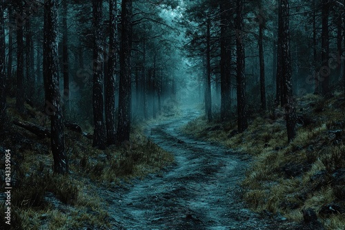 Obraz premium A misty forest path winds through tall dark trees