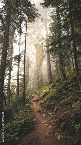 © Hungarian, Obraz premium A misty forest path winds through tall trees.