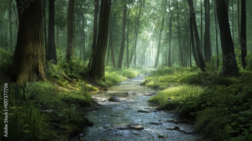 © musa, Obraz premium A misty forest path with a stream flowing through it.