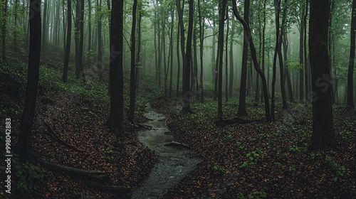 © bcendet, Obraz premium A misty forest path with a stream running through it.