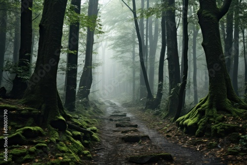 Obraz premium A Misty Forest Pathway: An ethereal forest covered in mist, with a narrow...