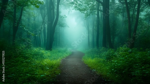 © QITIAN, Obraz premium A misty forest pathway surrounded by lush greenery.