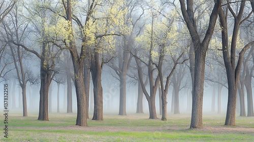 Naklejka premium A misty forest scene featuring numerous trees with emerging foliage