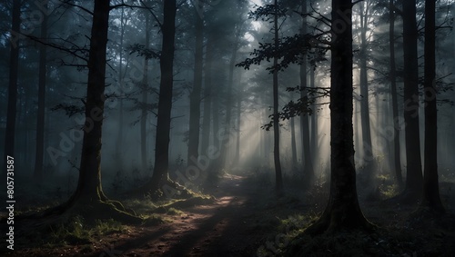 Fototapeta premium A misty forest scene with deep shadows and piercing light, evoking a moody atmosphere ai_generated