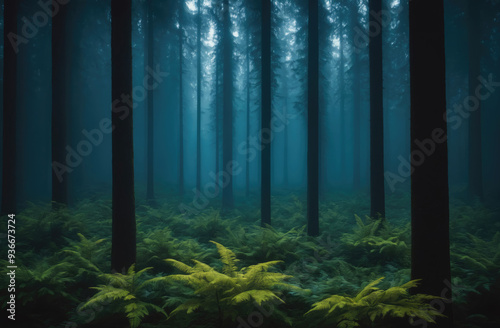 © Miklos, Naklejka premium A misty forest scene with tall trees and ferns in the foreground
