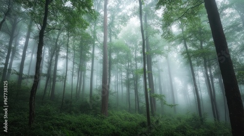 © BerkahStock, Obraz premium A misty forest scene with tall trees and lush greenery, evoking tranquility and nature's beauty.