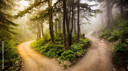 Fototapeta premium A misty forest with diverging paths, bathed in golden light filtering through...