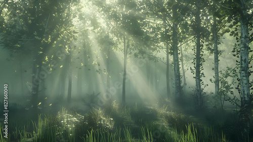Fototapeta premium A misty forest with sunlight filtering through the trees