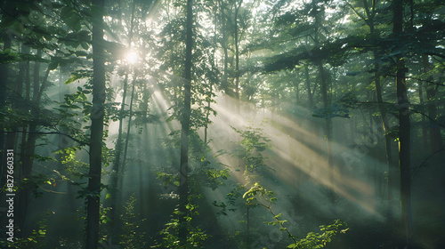 © Muhammad, Obraz premium A misty forest with sunlight filtering through the trees