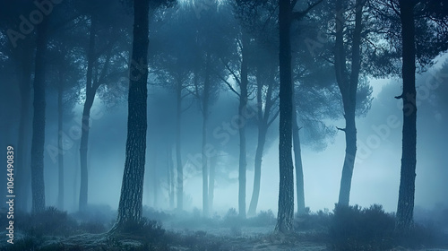 © Lailatul, Fototapeta premium A misty forest with tall pine trees reaching into the sky.