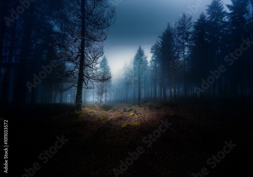 Obraz premium A misty forest with tall trees, a single ray of light illuminating the...