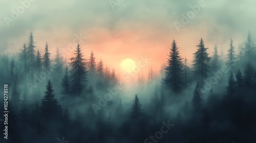 Naklejka premium A misty forest with tall trees and a sunrise peeking through the clouds.