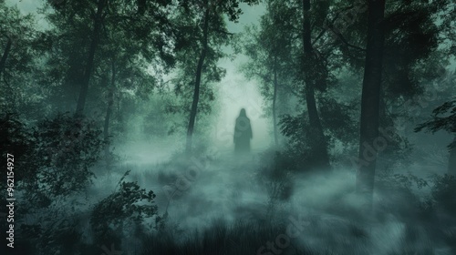 © Nonnarit, Fototapeta premium A misty forest with the shadow of a ghostly figure barely visible in the fog