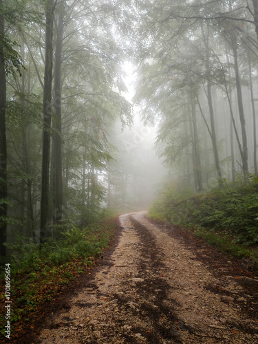Naklejka premium A misty gravel road winding through dense beech forest in the Bükk Plateau,...