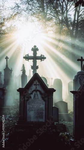 Fototapeta premium A misty graveyard scene with sun rays filtering through trees, highlighting...