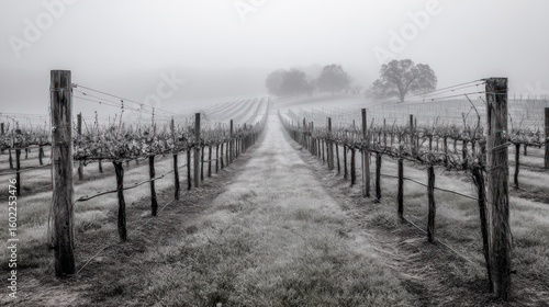 Naklejka premium A misty gray vineyard in early morning, elegant and timeless