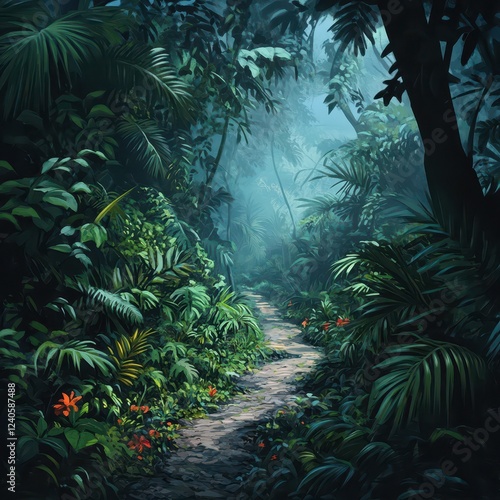 © NpicArt, Fototapeta premium A Misty Jungle Path Through Lush Tropical Foliage