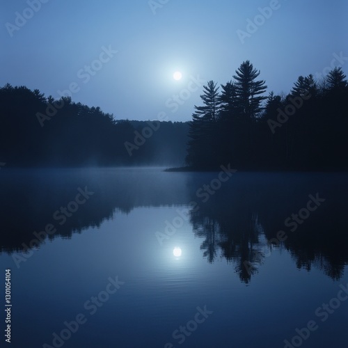 Fototapeta premium A misty lake at midnight, the moons reflection slightly distorted by gentle...