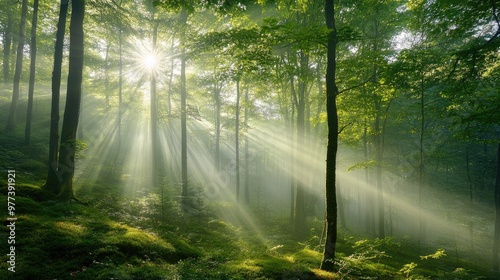 Fototapeta premium A misty morning forest with sunlight breaking through the fog.
