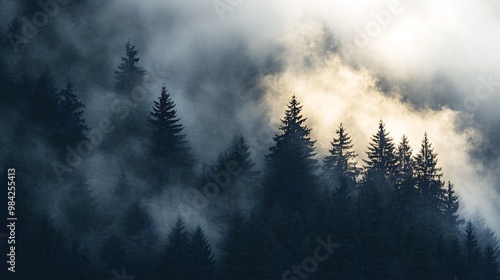 Fototapeta premium A misty morning in a forest with tall pine trees silhouetted against a bright cloudy sky.