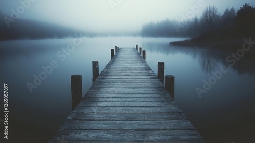 Naklejka premium A misty morning on a quiet lake with a wooden dock stretching into the distance, offering a serene and introspective scene.