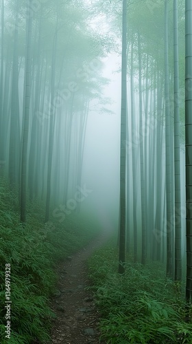 Naklejka premium A misty path meanders through a grove of tall bamboo trees