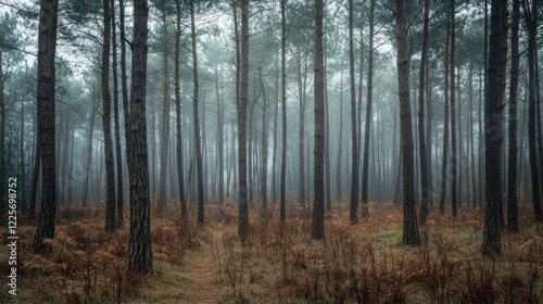 Obraz premium A Misty Path Through a Dense Pine Forest
