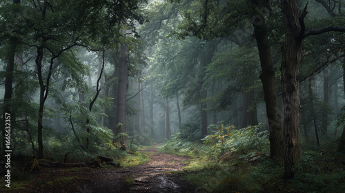 Naklejka premium A misty path winding through a dense forest with tall trees and lush green foliage all around it