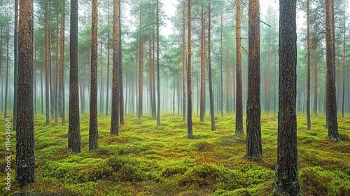 Fototapeta premium A misty pine forest where the entire ground is covered with a thick layer of green moss, background wallpaper AI generated image