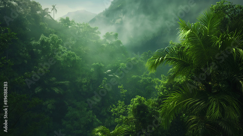 Obraz premium A misty rainforest awakens to the sound of chirping birds, lush greenery...