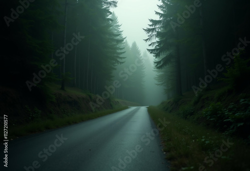 Fototapeta premium A misty road winds through a dark, dense forest, creating an eerie and...