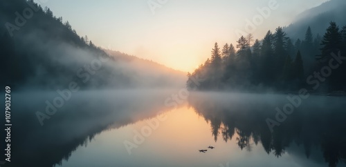 © Ilona, Fototapeta premium A misty sunrise over a lake with trees in the background