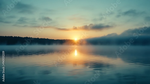 Naklejka premium A misty sunrise over a still lake, reflecting the golden light.