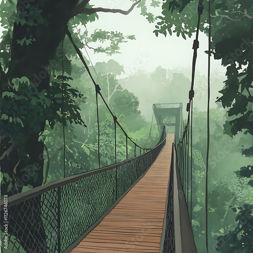 © ubolpun, Obraz premium A Misty Suspension Bridge Leading Through a Lush Rainforest Canopy.