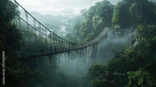 Fototapeta premium A misty suspension bridge winds through a lush tropical forest, disappearing into the dense greenery, evoking a sense of mystery and adventure