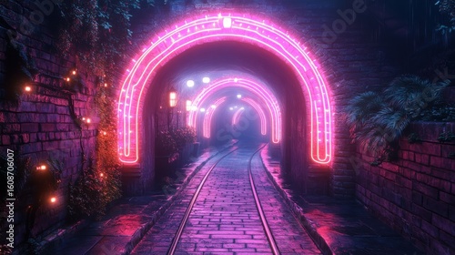 Fototapeta premium A misty tunnel illuminated by vibrant pink neon lights, creating a surreal...