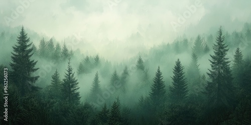 © kwanchaift, Obraz premium A misty view of a fir forest, evoking a nostalgic vintage feel.
