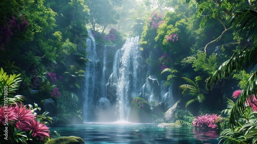 Fototapeta premium A misty waterfall cascading into a lush jungle, with exotic plants and flowers, illustration background