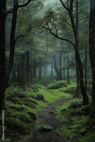 Naklejka premium A misty woodland path winds through a dense forest of towering trees..