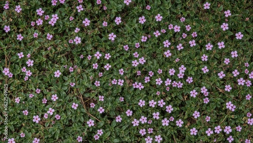 Naklejka premium A mix of pink thyme flowers and sedum plants thriving in a seaside meadow. Small purple blooms carpet the ground during warmer seasons.