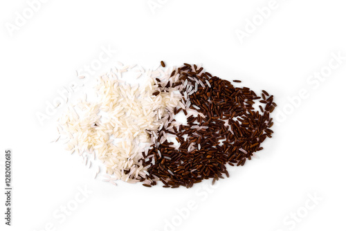 © Светлана Кушнир, Fototapeta premium A mixture of white and brown rice, scattered grains on a white background.