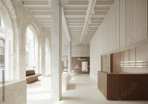 © Bundi, Fototapeta premium A mockup of a living room wall decoration, showing a leather sofa surrounded by decor on a white background