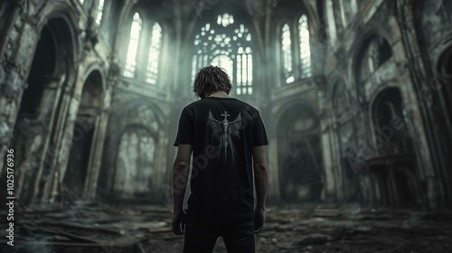 © ANDREI, Naklejka premium A mockup of a man in a black T-shirt in gothic look