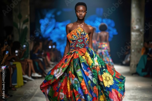 © SaroStock, Fototapeta premium A model gracefully walks the runway wearing a vibrant floral dress during a fashion show, surrounded by a colorful backdrop rich in blooming patterns and hues